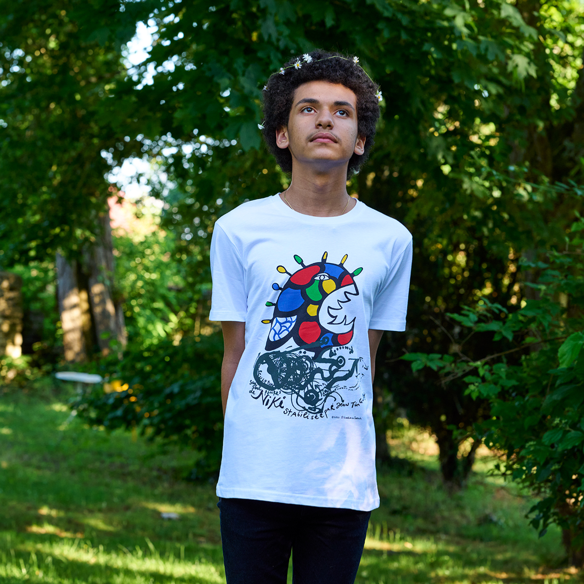 Niki de Saint Phalle and Jean Tinguely were lovers and collaborators in both art and life. They often worked together for monumental projects, in which Niki de Saint Phalle’s colorful sculptures were mounted on Tinguely’s black bases. This would give Saint Phalle’s designs kinetic energy, making the sculptures dance and twirl harmoniously.
